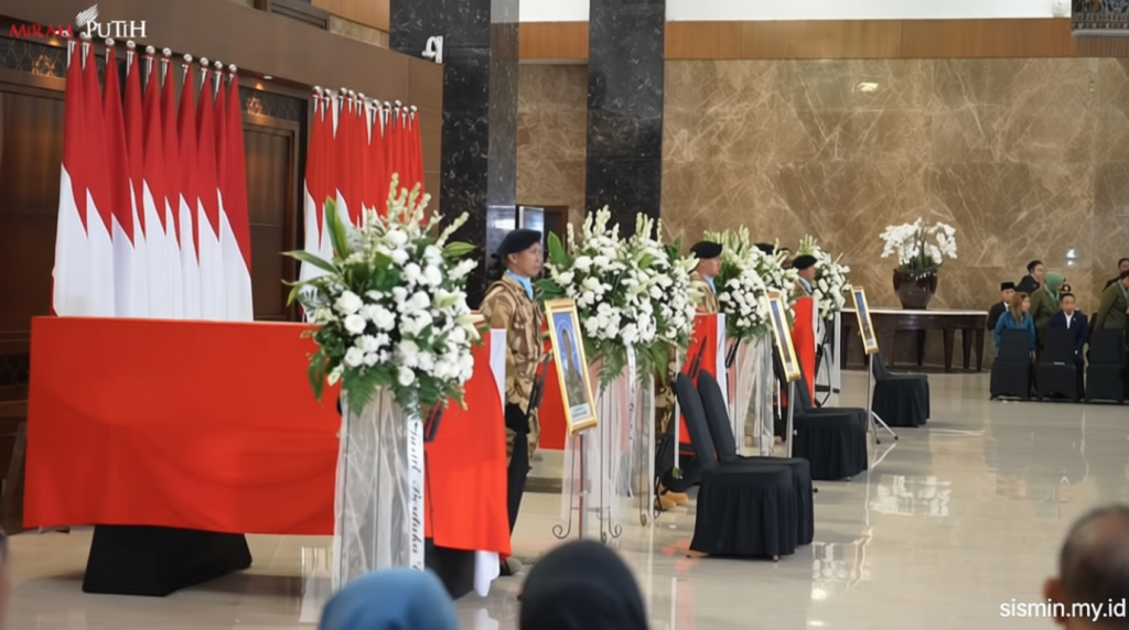 Prajurit yang meninggal tersebut telah disemayamkan dalam tiga peti jenazah berbalut bendera Merah Putih sejak pukul 18.25 WIB. Saat peti jenazah memasuki ruangan, beberapa anggota keluarga mengucapkan air mata. Prabowo kemudian memberikan penghormatan masing-masing kepada jenazah prajurit tersebut, sebelum menghadiri prosesi pelepasan.