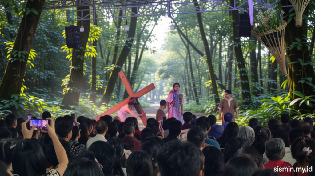Pantauan detikcom di lokasi menunjukkan, pertunjukan ‘Jalan Salib Kreatif’ dimulai pukul 08.50 WIB. Aktivitas ini berlangsung dengan nyanyian yang dinyanyikan, lalu diikuti oleh adegan drama yang diperankan oleh para peserta. Sejak pagi, jemaat sudah berkumpul di luar gedung gereja untuk menyaksikan rangkaian tersebut.