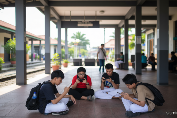 RI Meluncurkan Regulasi Baru, Penggunaan Media Sosial untuk Anak di Bawah 16 Tahun Dibatasi Di Jakarta, Senin (30/3/2026), sejumlah anak terlihat memainkan ponsel mereka setelah…