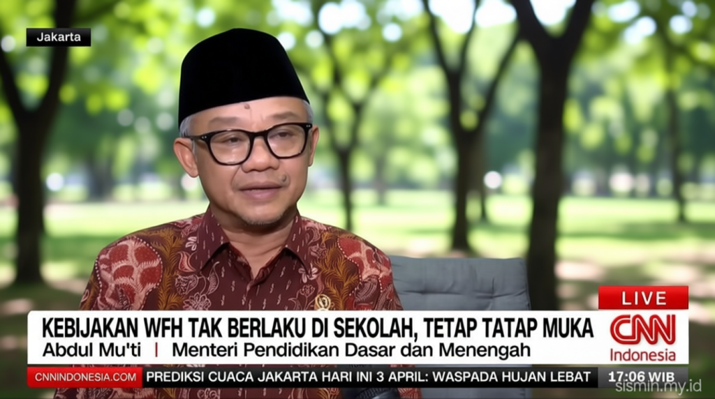 Menteri Pendidikan Dasar dan Menengah, Abdul Mu’ti, menyatakan bahwa sistem kerja jarak jauh di bawah yurisdiksi kementerian tersebut tidak diterapkan kepada guru.