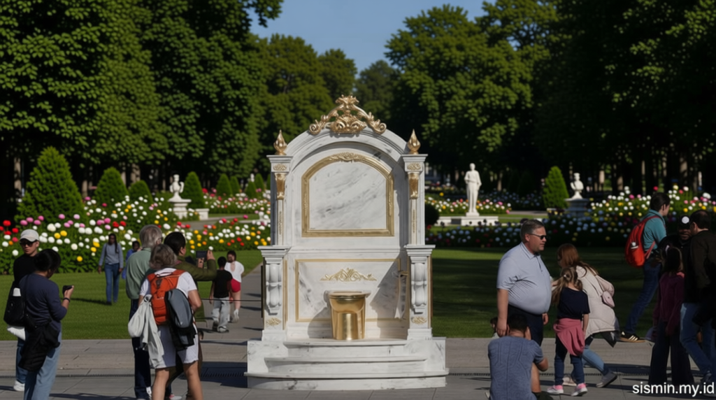 Sebuah instalasi seni berbentuk toilet emas kini terpajang di National Mall, Washington, yang dianggap sebagai bentuk penekanan terhadap gaya hidup Presiden Donald Trump. Patung ini muncul sebagai bagian dari upaya mengkritik pengeluaran besar dalam renovasi Gedung Putih, yang dianggap berlebihan oleh sejumlah pihak.