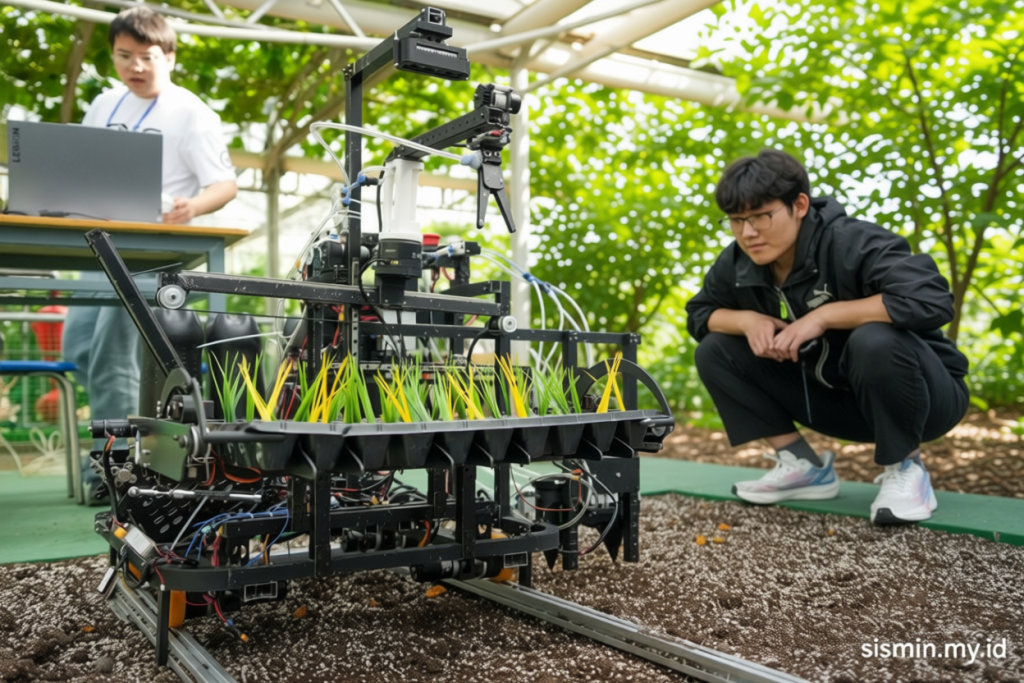 Dalam pameran tersebut, pengunjung dapat mengamati robot penyemprot tanaman yang beroperasi secara otomatis. Peralatan ini dirancang untuk efisiensi dalam distribusi pupuk dan cairan penggenangan, meminimalkan kesalahan dan penggunaan bahan kimia berlebihan.
