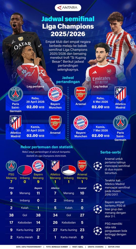 Empat tim unggulan dari negara-negara berbeda berhasil melangkah ke babak semifinal Liga Champions musim 2025/2026, bersiap untuk memperebutkan gelar bergengsi ‘Si Kuping Besar’.