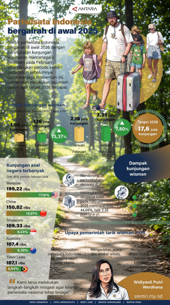 Pertumbuhan sektor pariwisata Indonesia menunjukkan tanda-tanda positif di awal tahun 2026, terbukti dari peningkatan jumlah wisatawan asing yang berkunjung pada bulan Februari dibandingkan periode yang sama tahun lalu. Angka kunjungan wisman mencapai level lebih tinggi, mengisyaratkan perbaikan tren yang sebelumnya terhambat.