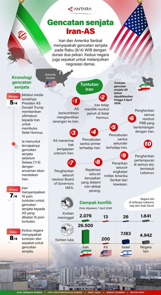 Pada Rabu (8 April) WIB, Iran dan Amerika Serikat mencapai kesepakatan gencatan senjata selama dua minggu. Langkah ini diambil sebagai bagian dari upaya menyelesaikan ketegangan yang terjadi antara kedua negara.