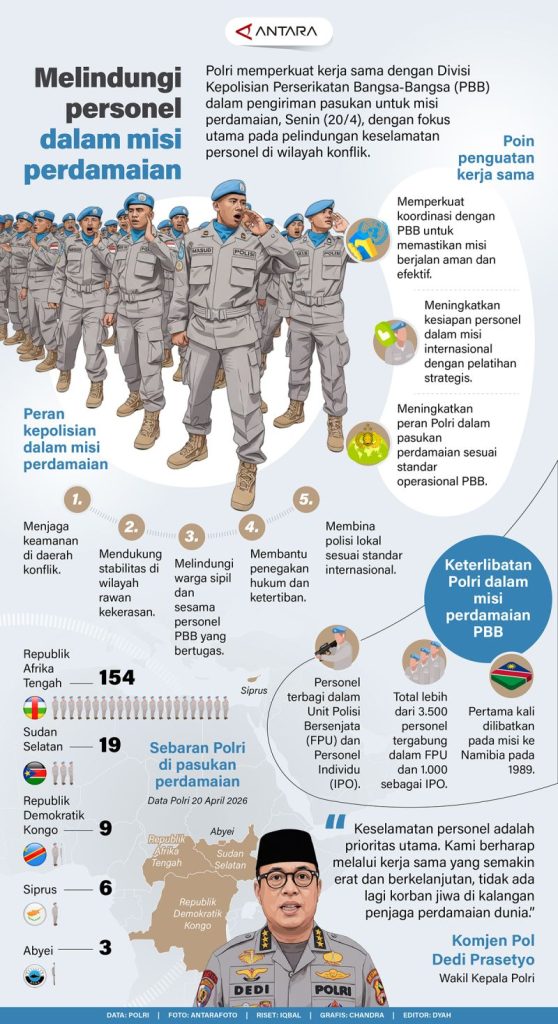 Senin (20/4), Polri memperkuat kerja sama dengan Divisi Kepolisian Perserikatan Bangsa-Bangsa (UN Police Division) dalam pengiriman pasukan untuk operasi perdamaian. Upaya ini menitikberatkan pada upaya memastikan keamanan anggota yang bertugas di daerah rentan konflik.