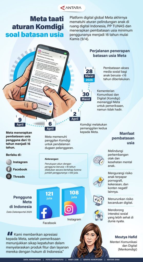 Meta, platform digital global, akhirnya menerapkan kebijakan Komdigi yang mengatur batasan usia minimum pengguna menjadi 16 tahun. Langkah ini mulai berlaku sejak Kamis (9/4), sebagai tindak lanjut dari PP TUNAS.