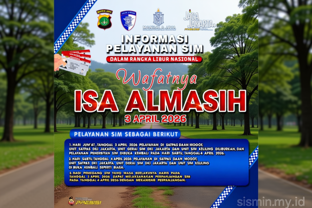 Polda Metro Jaya mengumumkan bahwa layanan Surat Izin Mengemudi (SIM) Keliling di DKI Jakarta akan berhenti sementara pada Jumat, 3 April 2026. Pengumuman ini dikeluarkan melalui akun X resmi @tmcpoldametro, yang menyebutkan hari tersebut jatuh pada hari libur nasional mengingat peristiwa wafat Isa Almasih.