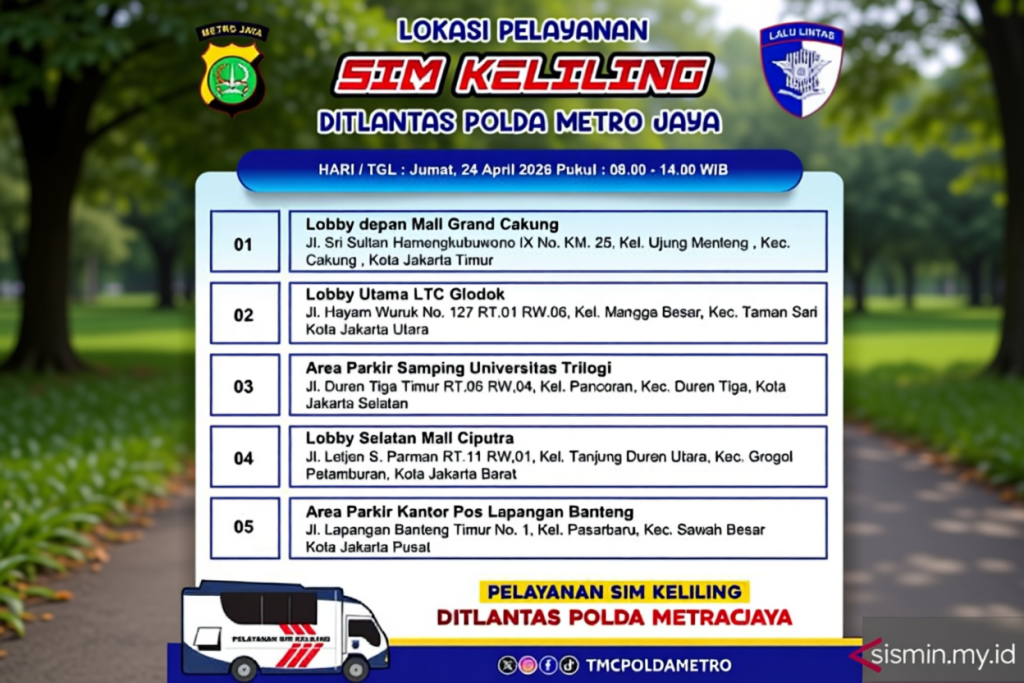 Direktorat Lalu Lintas (Ditlantas) Polda Metro Jaya menyediakan layanan SIM Keliling di lima titik strategis di Jakarta pada hari Jumat, yang memudahkan masyarakat dalam memperpanjang masa berlaku SIM untuk kendaraan bermotor. Layanan ini beroperasi mulai pukul 08.00 sampai 14.00 WIB di lokasi berikut: