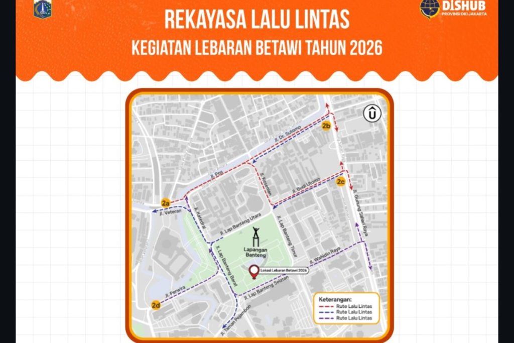 Jakarta – Dinas Perhubungan DKI Jakarta telah mengatur alur lalu lintas di sekitar Lapangan Banteng, Jakarta Pusat, selama tiga hari, mulai Jumat, 10 April hingga Minggu, 12 April 2026. Pengaturan ini bertujuan mendukung penyelenggaraan acara Lebaran Betawi yang digelar di kawasan tersebut.