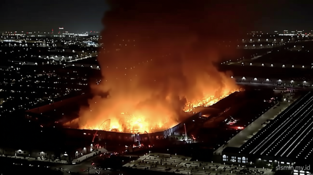 Menurut laporan Reuters, kebakaran semalaman mengakibatkan kerusakan parah pada gudang, dengan sejumlah kendaraan pemadam masih berada di lokasi saat petugas berusaha menenangkan titik api.