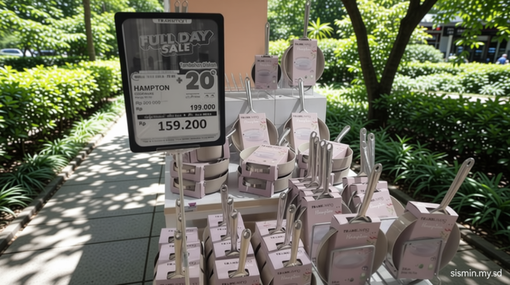 Tambahan ini berlaku sebagai pelengkap dari diskon utama yang sudah tersedia. Salah satu contoh produk yang masuk dalam promo ini adalah panci dan teflon merek Maxim dan Maspion. Harganya ditawarkan mulai dari Rp 99.900 per unit, dari harga normal sebelumnya yang mencapai Rp 1.199.000 per unit.