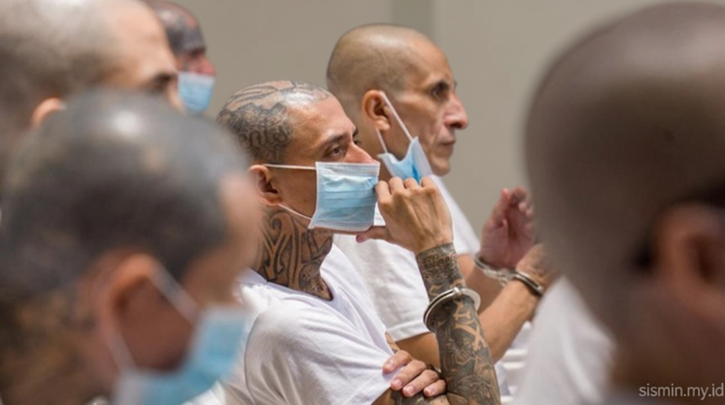 Di El Salvador, pengadilan sedang mengadili hampir 500 anggota Mara Salvatrucha (MS-13) yang dikenal dengan kebrutalan mereka. Sidang massal ini menargetkan ribuan kasus kejahatan, termasuk pembunuhan. (REUTERS/Jose Cabezas)
