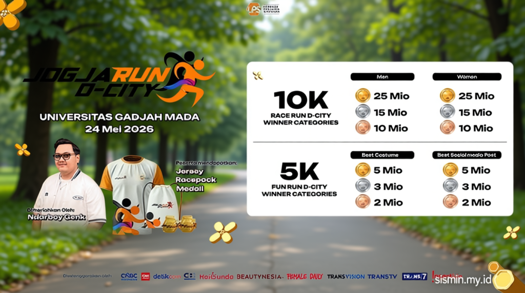 Acara Jogja Run D-City akan berlangsung pada Minggu, 24 Mei 2026, di Universitas Gadjah Mada. Event ini dihadirkan oleh Transmedia sebagai festival olahraga yang menawarkan pengalaman berlari unik di tengah Kota Yogyakarta. Tujuan utama acara ini adalah memperkaya kebersamaan, kehidupan sehat, serta mempromosikan sport tourism melalui rute yang mengikuti landmark ikonik kota.