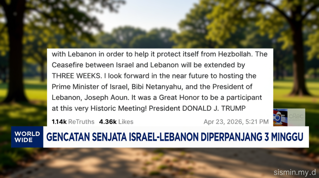 Presiden Amerika Serikat Donald Trump mengumumkan bahwa gencatan senjata antara Israel dan Lebanon diperpanjang selama tiga minggu. Pengumuman ini dilakukan dalam konteks upaya menenangkan situasi konflik yang terjadi di wilayah tersebut.