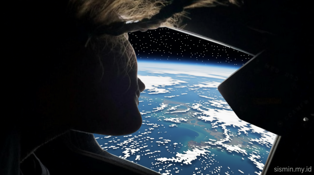 Dari jarak 64.000 kilometer, Red Wiseman mengatakan bahwa Bumi terlihat seperti bola dunia yang semakin kecil dan terang karena cahaya matahari.